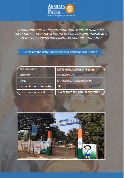 To ensure that there is complete transparency I shall get a report from NGO (this takes between 2 to 4 months usually after the funds are raised & transferred to them) telling me who benefitted from the funding. The details will then be posted from Akshaya Patra on the UPDATES section of my campaign. As soon as I post an update, the platform will send an SMS and EMAIL alert to all the funders - i.e. to you. Click on the link on the email and you can read about who benefitted. That's transparent right.