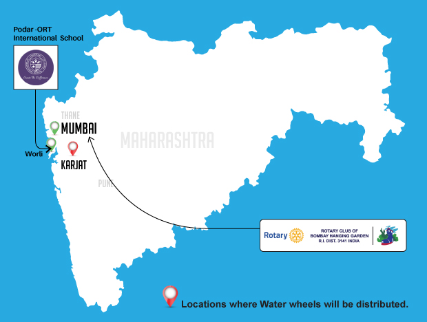 The map shown here highlights the location of the area where these water wheels will be distributed. The NGO- Habitat for Humanity India, is based in Mumbai.