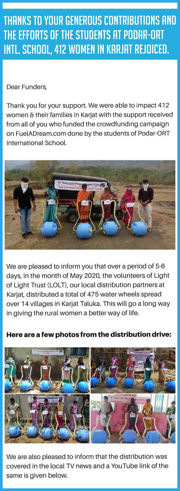 I am raising INR 25,000 or more to impact 10 women or more in rural areas of Karjat by giving each of them a Water Wheel. Each water wheel has a capacity of 45 litres and one trip in a day is enough for the needs of the entire household typically.