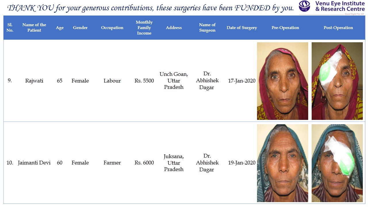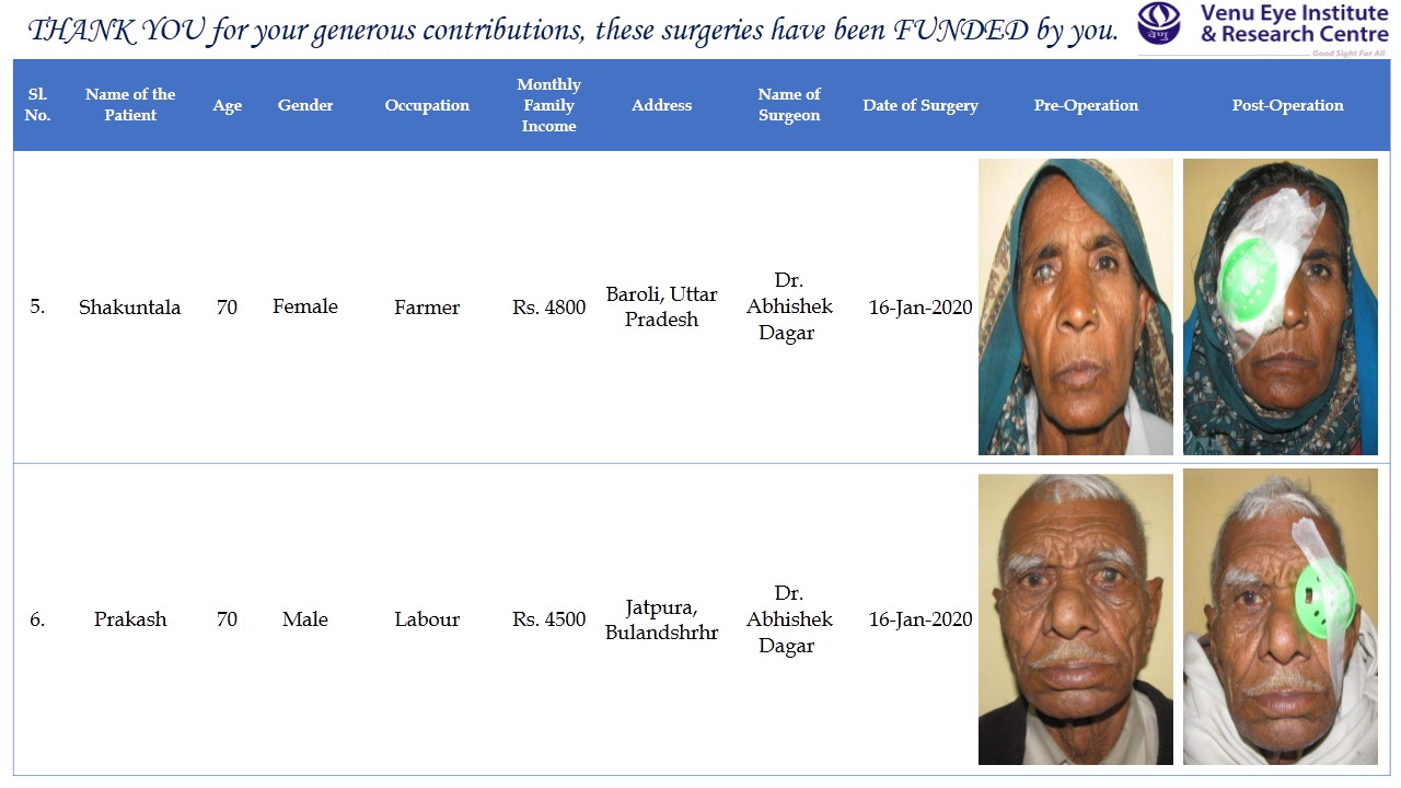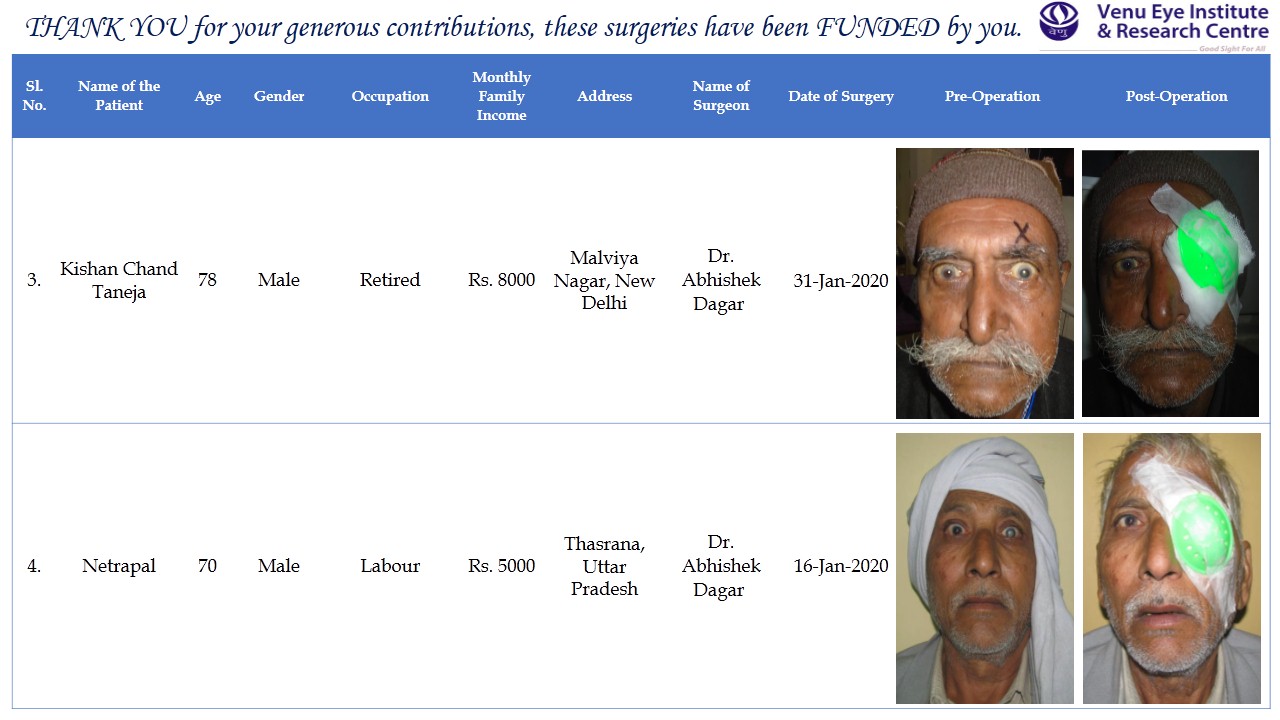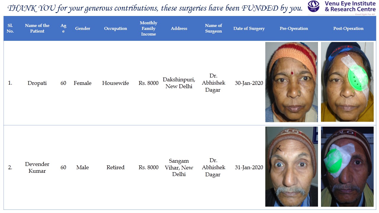 The money raised will be given to our partners Venu Eye Institute. Once the money is given, Venu Eye Institute will use it to do cataract surgeries for the elderly poor in villages and rural areas of Delhi & NCR area and share the details with me. I shall then post an update giving you details of the elderly whose eyesight has been corrected so that you know where your money has gone.