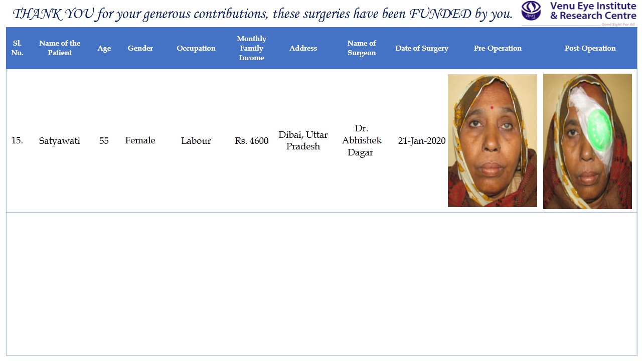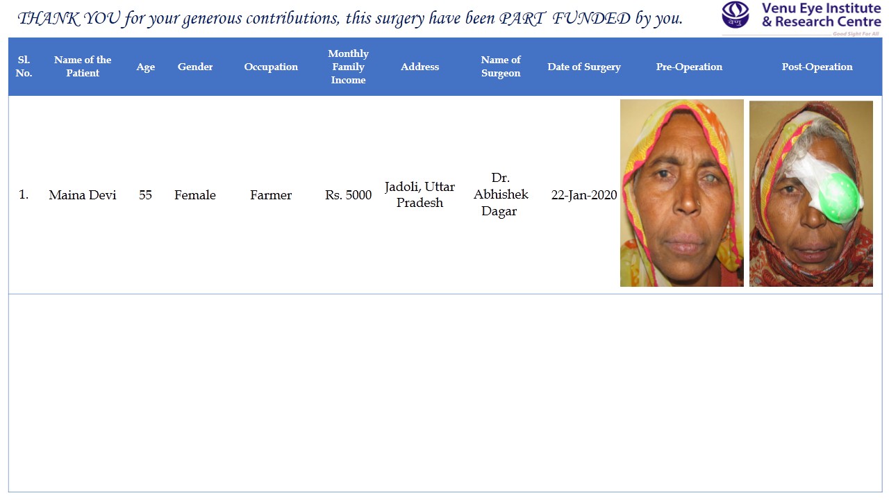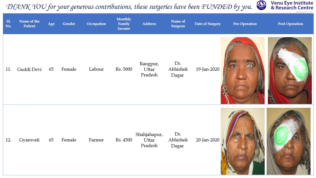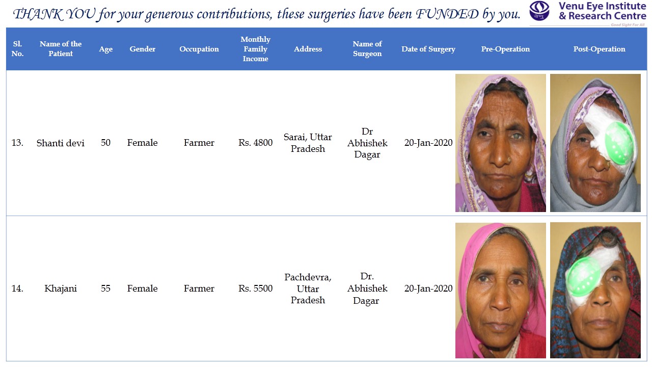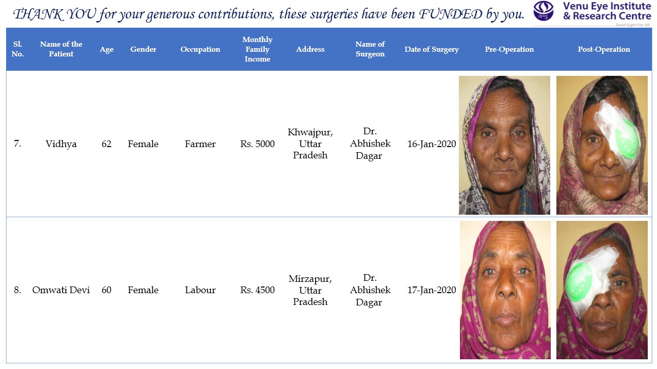 The money raised will be given to our partners Venu Eye Institute. Once the money is given, Venu Eye Institute will use it to do cataract surgeries for the elderly poor in villages and rural areas of Delhi & NCR area and share the details with me. I shall then post an update giving you details of the elderly whose eyesight has been corrected so that you know where your money has gone.