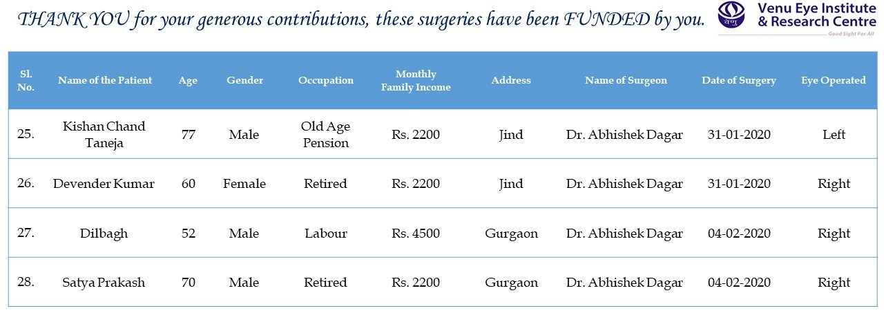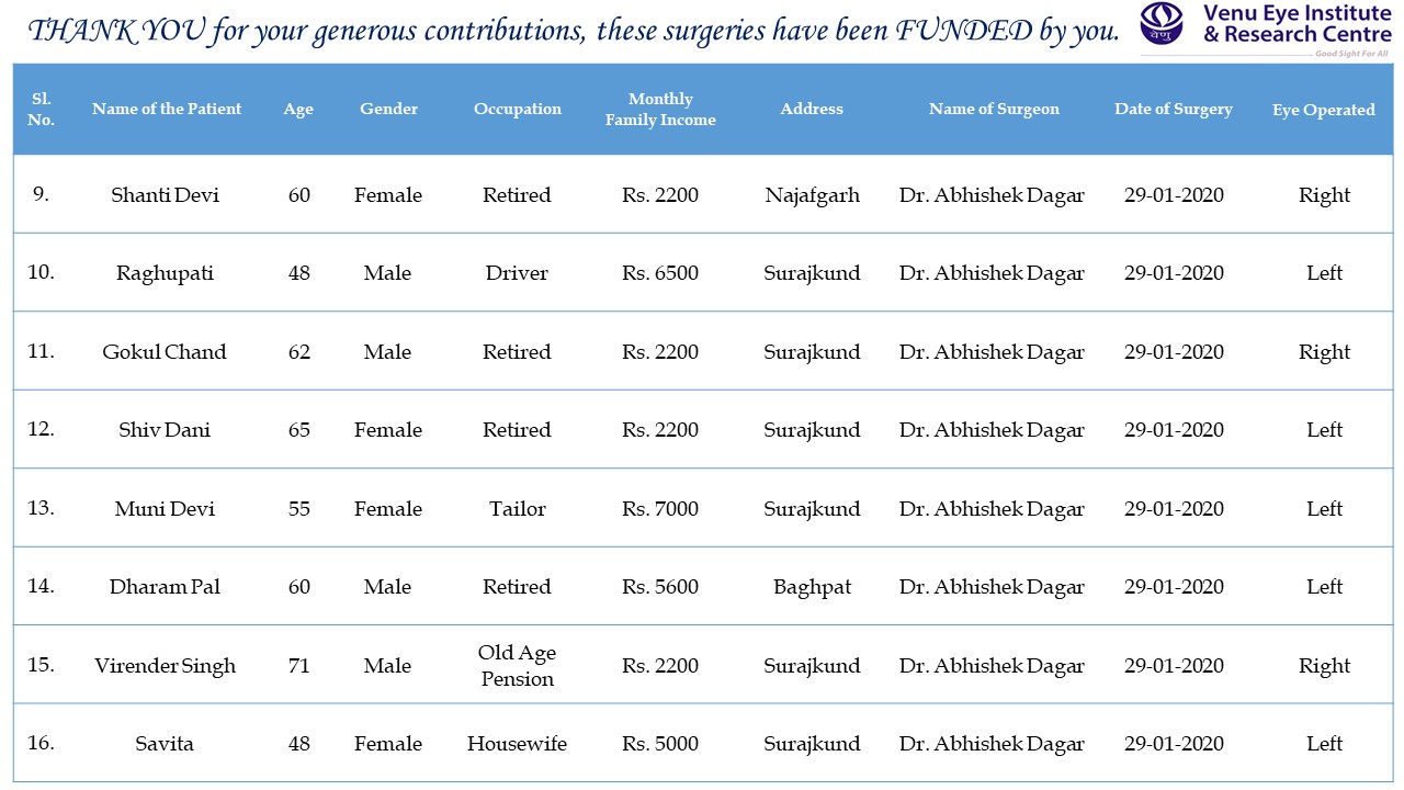 The money raised will be given to our partners Venu Eye Institute. Once the money is given, Venu Eye Institute will use it to do cataract surgeries for the elderly poor in villages and rural areas of Delhi & NCR area and share the details with me. I shall then post an update giving you details of the elderly whose eyesight has been corrected so that you know where your money has gone.