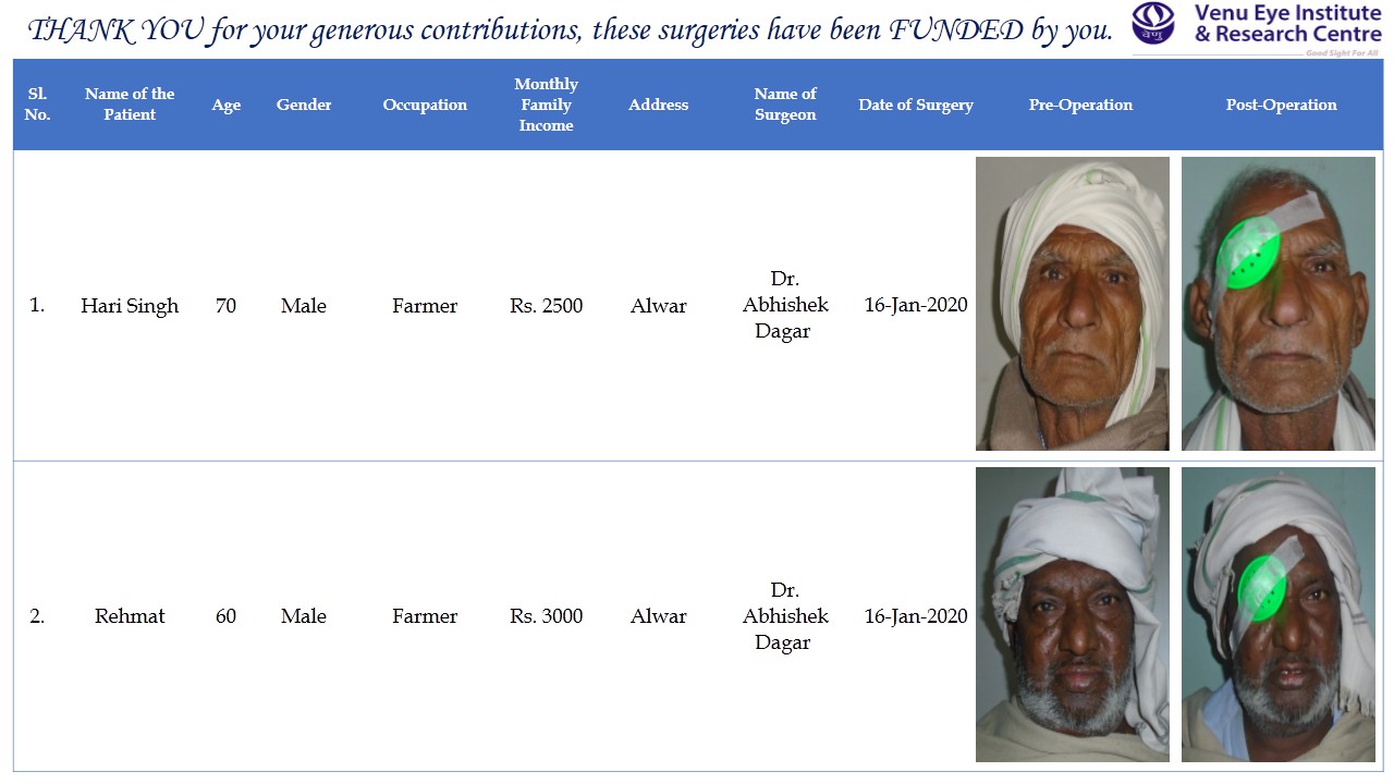 Just INR 1500 from you will GIVE SIGHT to 1 elderly person. So if you fund INR 3000 it will GIVE SIGHT to 2 people.