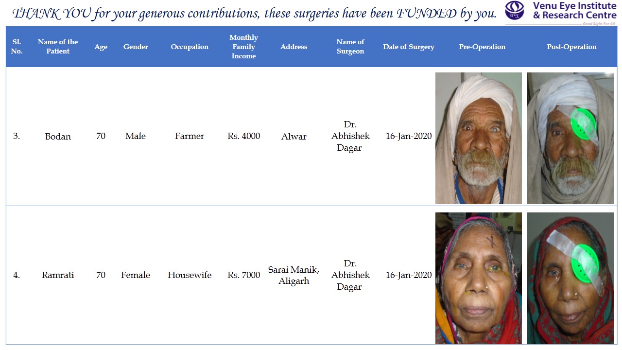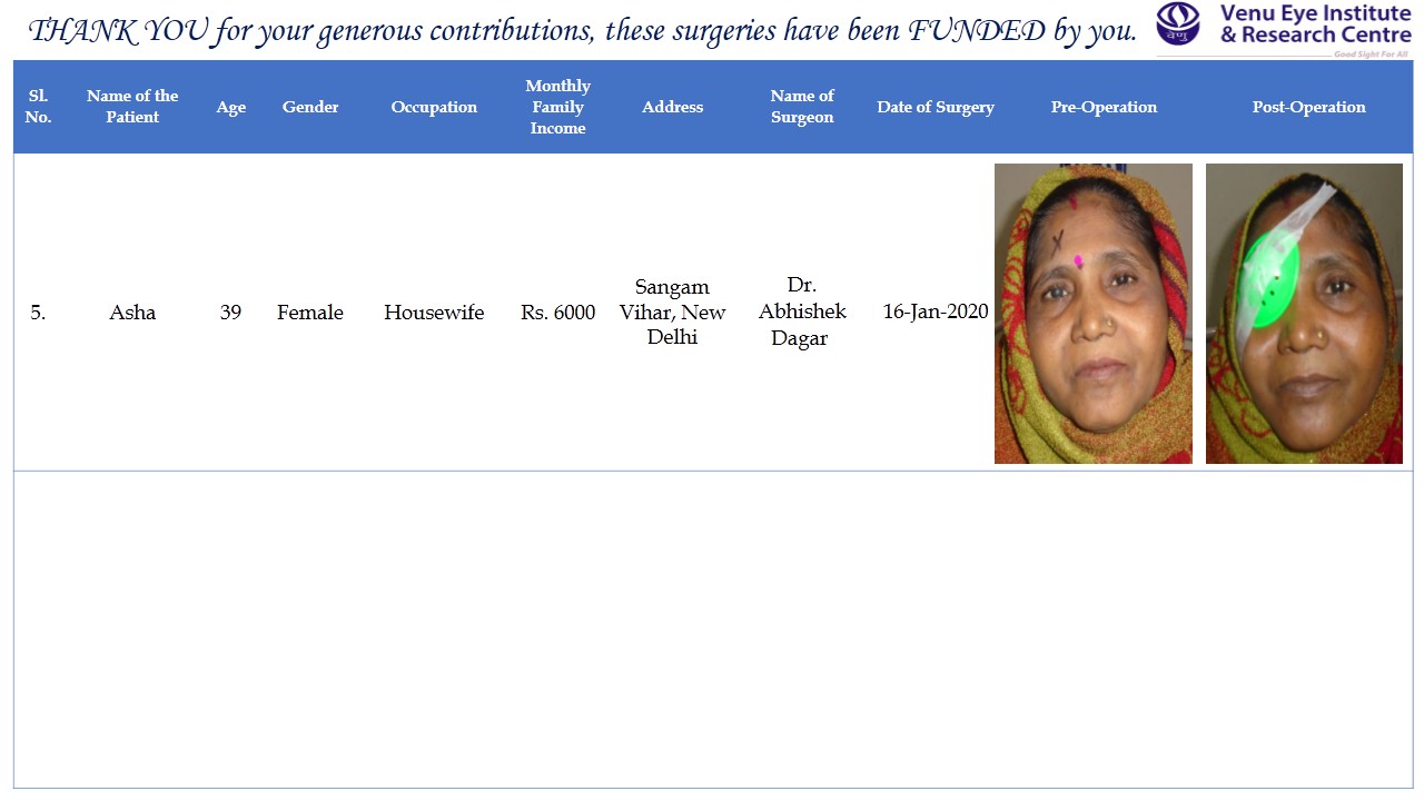 The money raised will be given to our partners Venu Eye Institute. Once the money is given, Venu Eye Institute will use it to do cataract surgeries for the elderly poor in villages and rural areas of Delhi & NCR area and share the details with me. I shall then post an update giving you details of the elderly whose eyesight has been corrected so that you know where your money has gone.