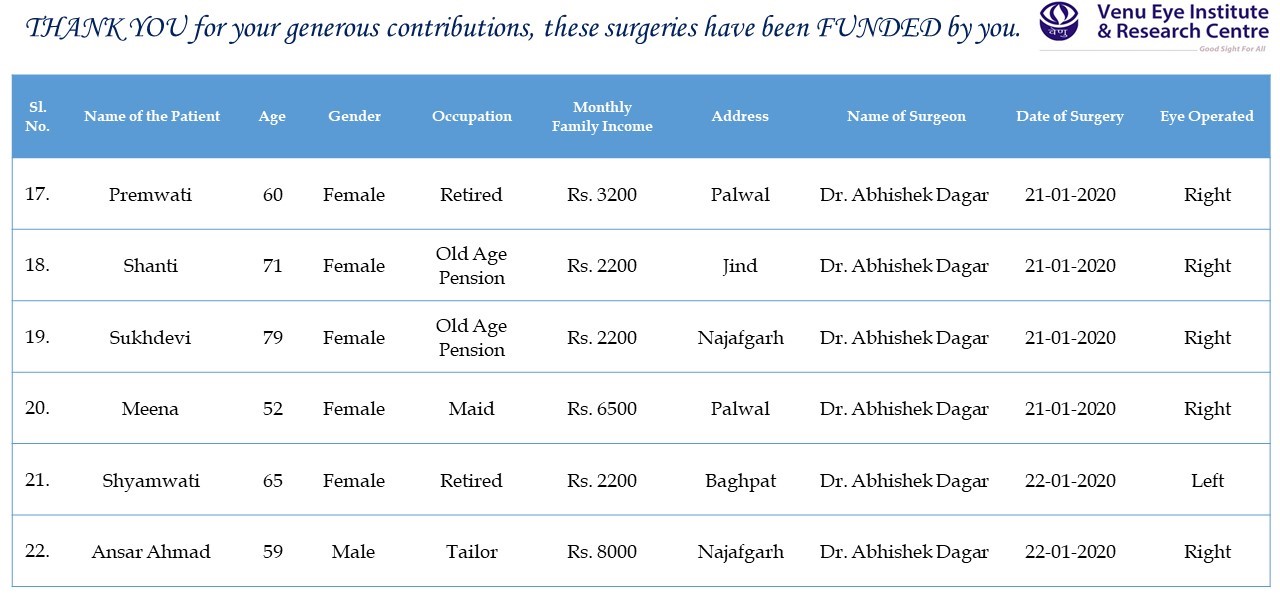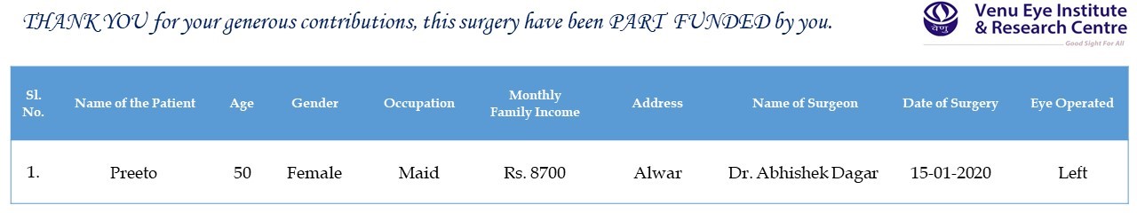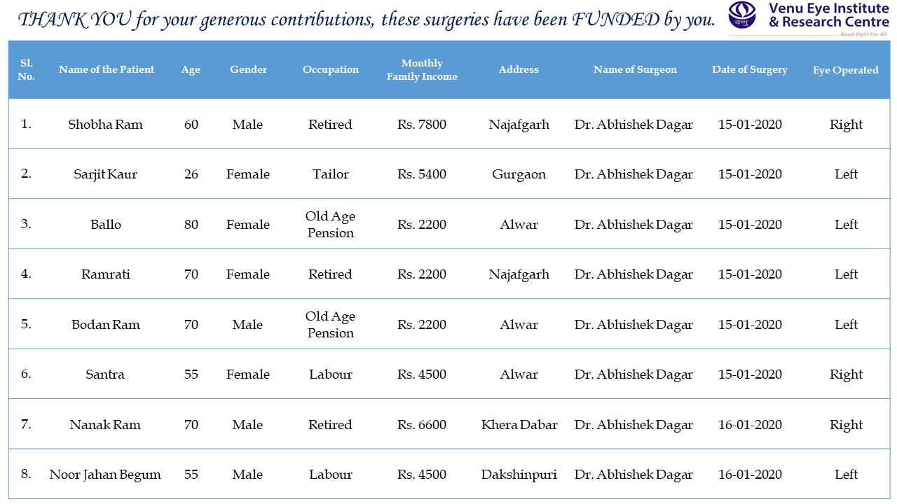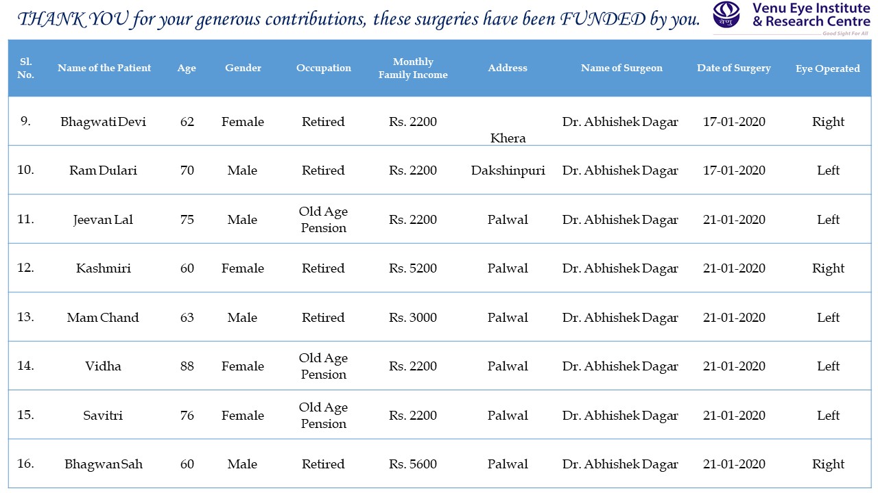 The money raised will be given to our partners Venu Eye Institute. Once the money is given, Venu Eye Institute will use it to do cataract surgeries for the elderly poor in villages and rural areas of Delhi & NCR area and share the details with me. I shall then post an update giving you details of the elderly whose eyesight has been corrected so that you know where your money has gone.