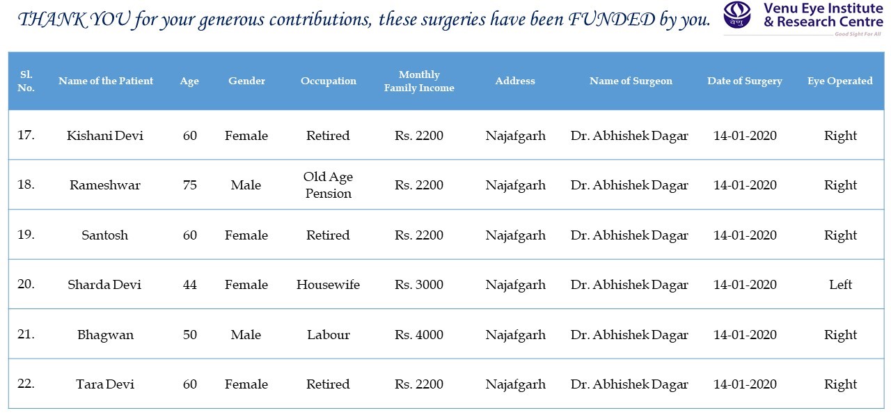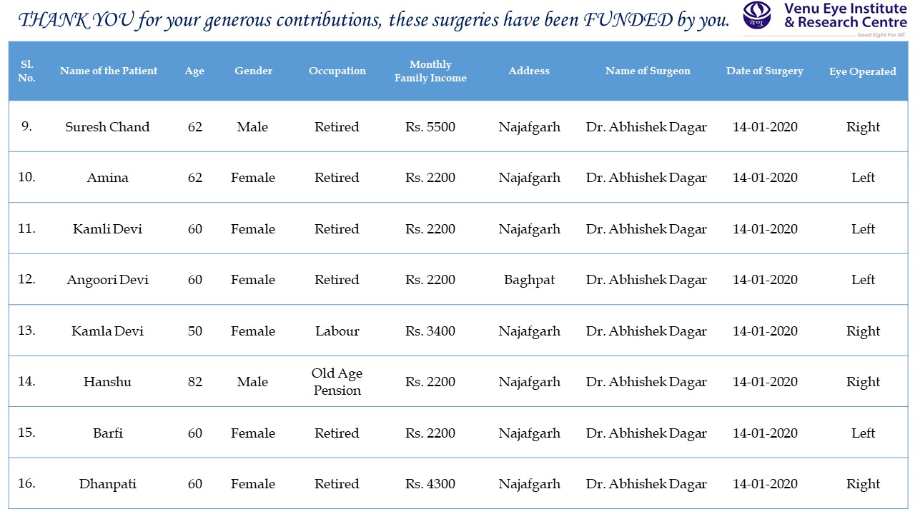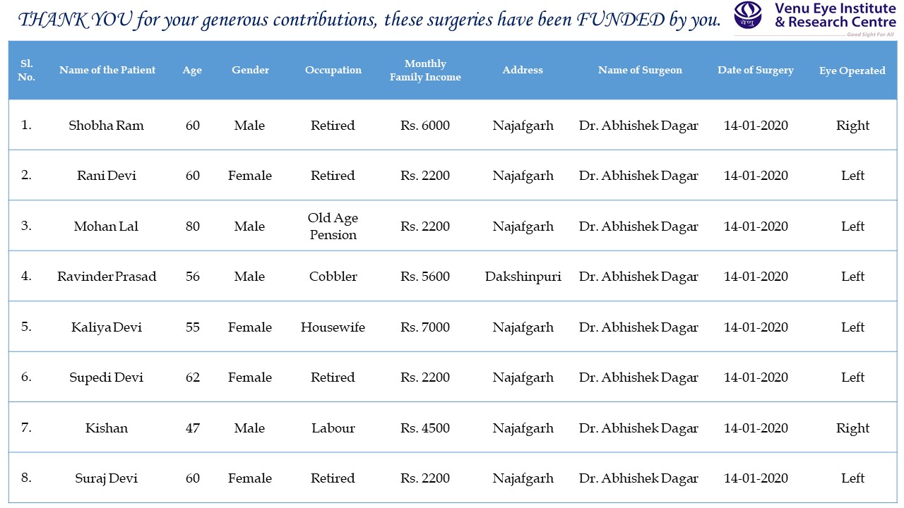 The money raised will be given to our partners Venu Eye Institute. Once the money is given, Venu Eye Institute will use it to do cataract surgeries for the elderly poor in villages and rural areas of Delhi & NCR area and share the details with me. I shall then post an update giving you details of the elderly whose eyesight has been corrected so that you know where your money has gone.