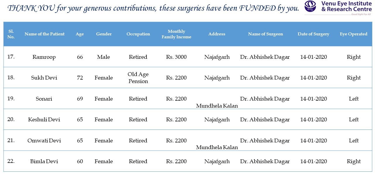 The money raised will be given to our partners Venu Eye Institute. Once the money is given, Venu Eye Institute will use it to do cataract surgeries for the elderly poor in villages and rural areas of Delhi & NCR area and share the details with me. I shall then post an update giving you details of the elderly whose eyesight has been corrected so that you know where your money has gone.