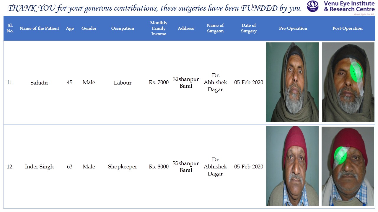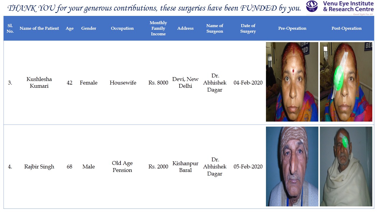 The money raised will be given to our partners Venu Eye Institute. Once the money is given, Venu Eye Institute will use it to do cataract surgeries for the elderly poor in villages and rural areas of Delhi & NCR area and share the details with me. I shall then post an update giving you details of the elderly whose eyesight has been corrected so that you know where your money has gone.