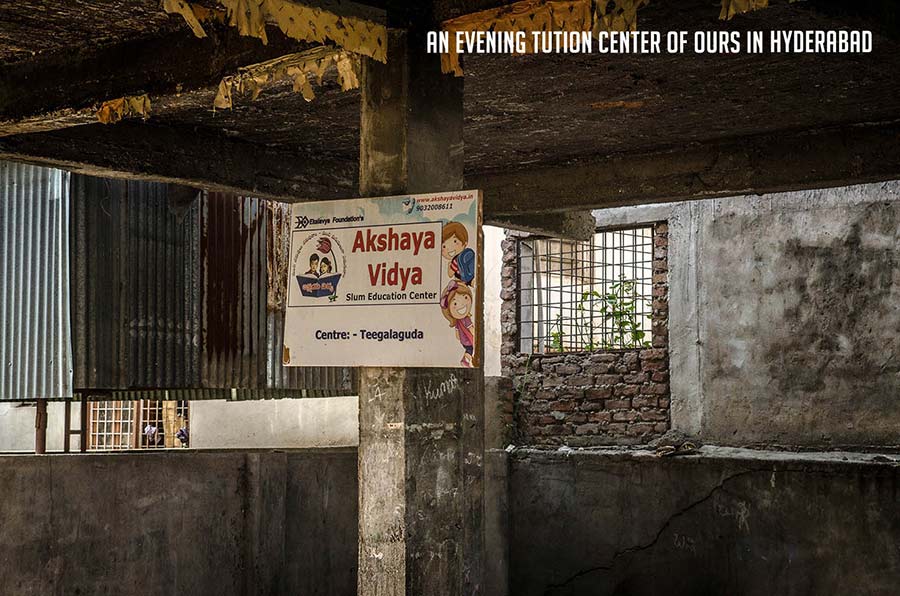 Started in 2011, Akshaya Vidya is an endeavour that is aimed at development of urban slum dwellers with a primary focus on education. In order to reach these children and make a difference we have started 30 tuition centres that reach about 1200 students. Our focus is to expand to 50 slums in the city of Hyderabad. (There are a total of 1000 slums in Hyderabad)