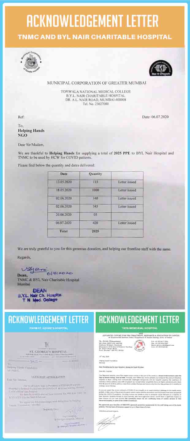 The funds raised will help healthcare workers at TATA MEMORIAL, NAIR HOSPITAL, GOKULDAS TEJPAL HOSPITAL, CAMA AND ALBLESS HOSPITAL, DR. R N COOPER MUNICIPAL GENERAL HOSPITAL, ST. GEORGE'S HOSPITAL and LOKMANYA TILAK (SION) HOSPITAL. (Scroll down the story to see the appeal letters and requirements from these hospitals)