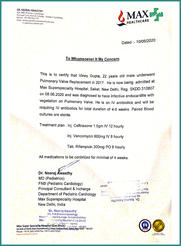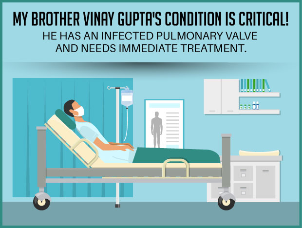 I have admitted my brother, Vinay Gupta, to the Max Super Speciality Hospital, Saket, Delhi. He is currently in ICU under 24*7 supervision. The doctors told me that there are 60% chances of removing the infection through antibiotics but if they don’t work, then the doctors will have to perform open-heart surgery to remove the infection or else it will affect the entire heart.