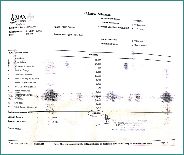 The approximate cost for one week as estimated by Max Hospital is INR 1.26L leading to an average of about INR 5L estimate for a 4-week stay there. In addition, he has just been diagnosed with COVID-19 and that adds a whopping 25000 INR additional cost PER DAY. Hence we are increasing the goal of this campaign to INR 8L.