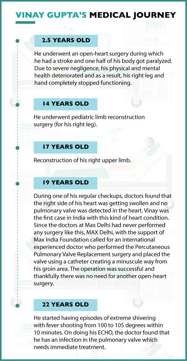 Time passed by and his health became better. From hopping he was now running. Then one day, during his regular checkups in 2016, doctors found that the right side of his heart was getting swollen and no pulmonary valve was detected in the heart. Vinay was the first case in India to have this kind of heart condition. All the doctors at Max Delhi told us that they had never performed any surgery like this, hence MAX India with the help of Max India Foundation called for an internationally experienced doctor who performed the operation and placed the valve using a catheter creating minuscule way from his groin area. Thankfully no open-heart surgery was required and the operation was successful.