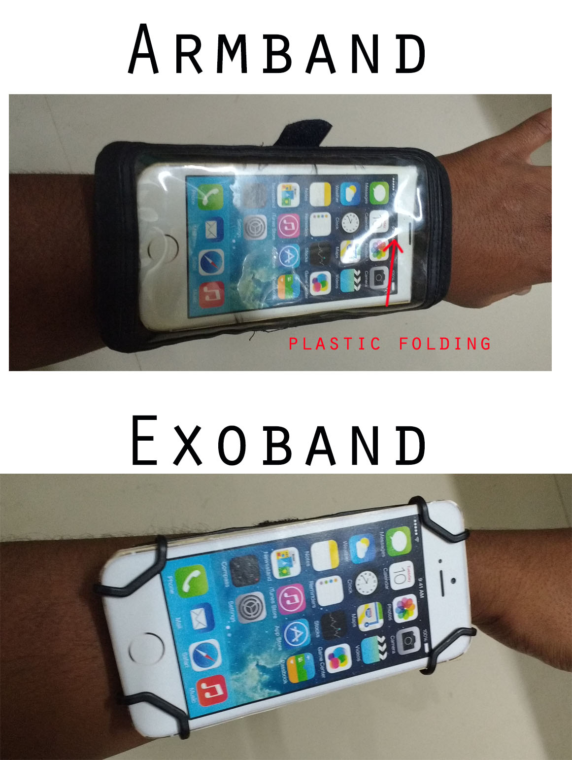 5. The plastic cover on an Armband causes folds because of which the touch sensitivity and the clarity of the phone decreases. The plastic covering also causes the phone to heat which may make the phone hang or lag. But as the Exoband does not have a cover, you have direct access to the touch screen and to all the functions of the phone. Also, as the exoband is held by just the clamps and does not require a cover there are less chances of your phone heating up and lagging/hanging.
