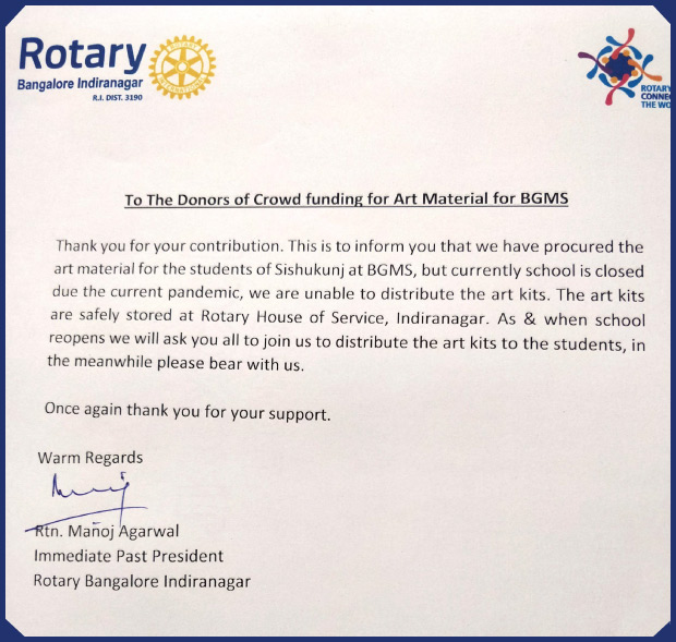 Funding to this campaign is eligible for tax breaks as Rotary Bangalore Indiranagar is registered & you can avail of benefits under section 80G of the IT Act. Foreign funding is accepted.
