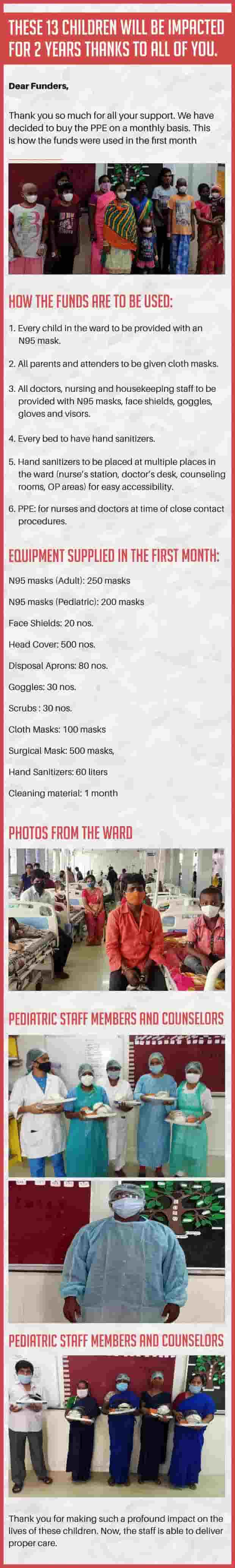 This campaign of mine aims to raise funds to provide PPE KITS, N-95 masks, Sanitizers, Liquid Dettol soap, etc that can be used by the staff, kids and will help keep the Pediatric wards and the kids safer. The cost of doing this for a month is estimated at INR 100000. Help me raise much more than that. Together we can keep these children suffering from cancer safer and help them recover faster.