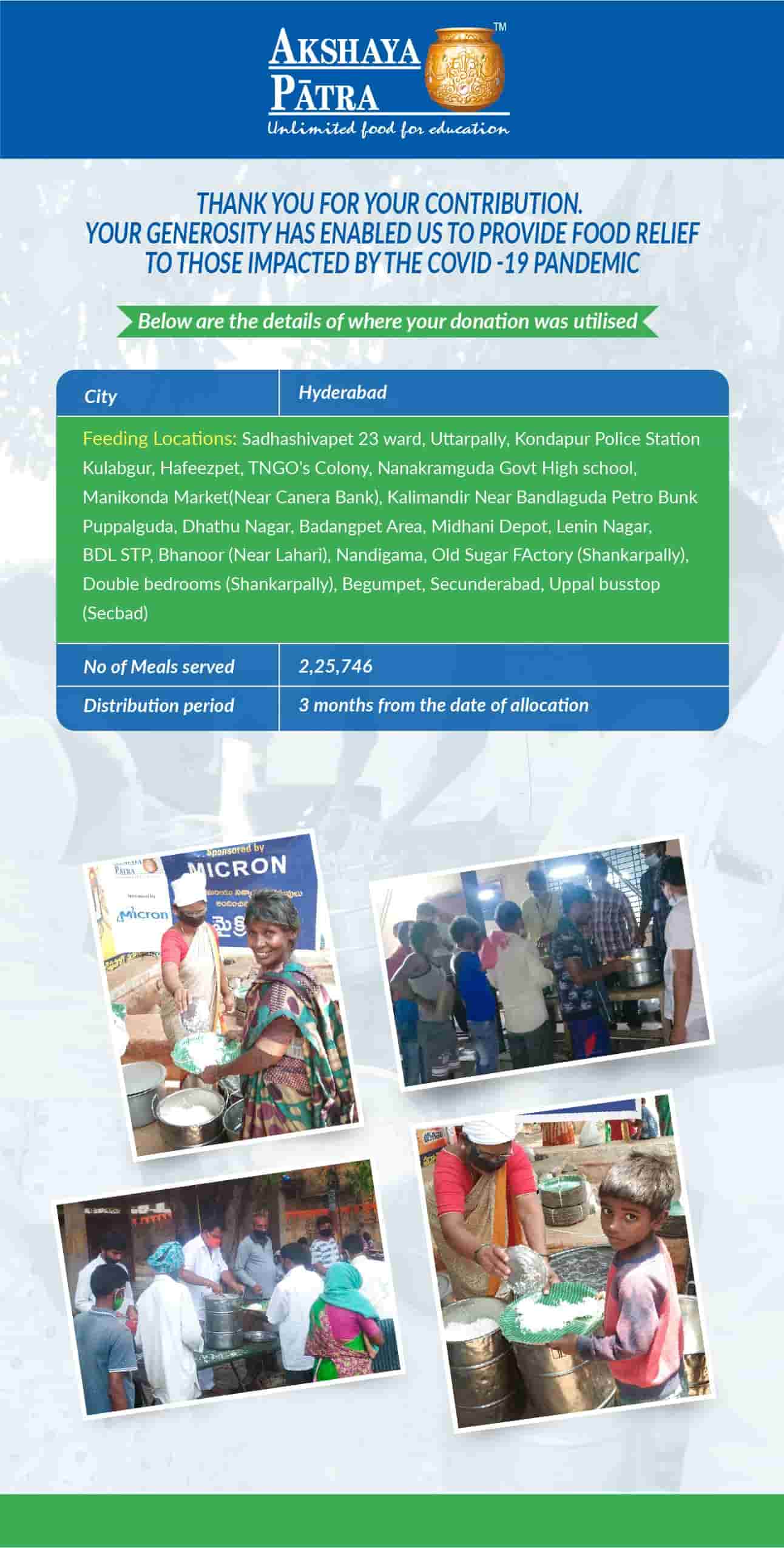 We are the privileged ones and it is our duty to must step up to help them through these difficult times. I request all of you to support my campaign so that we can also ease their hardship in our own small way. This campaign aims to provide meals and bottled water to them across Hyderabad and is done by Akshaya Patra( through their kitchens) in close coordination with the local administration. Let's come together and do our bit to help our fellow countrymen.