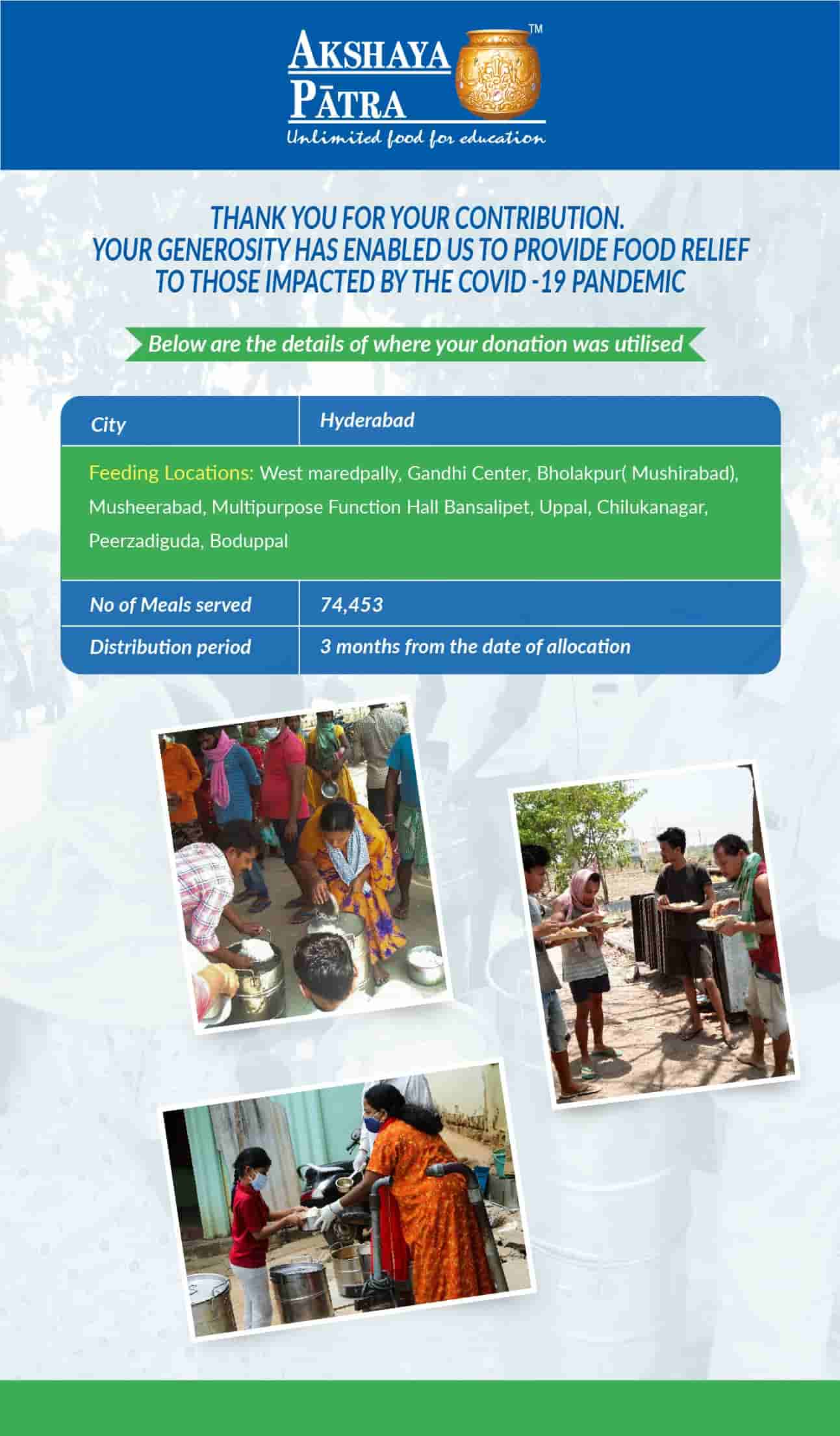 We are the privileged ones and it is our duty to must step up to help them through these difficult times. I request all of you to support my campaign so that we can also ease their hardship in our own small way. This campaign aims to provide meals and bottled water to them across Hyderabad and is done by Akshaya Patra( through their kitchens) in close coordination with the local administration. Let's come together and do our bit to help our fellow countrymen.