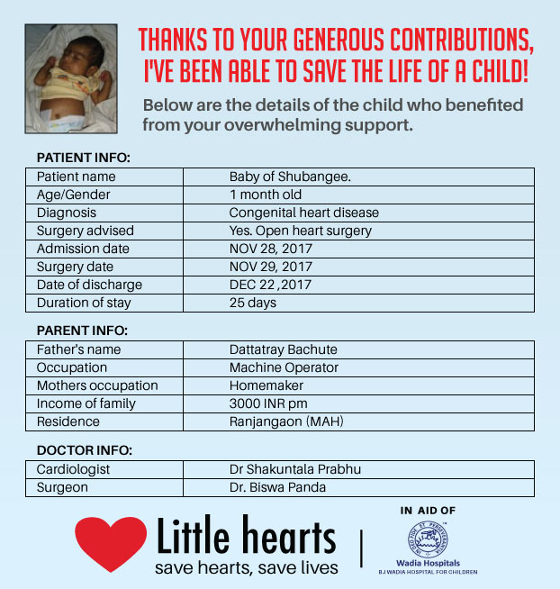 We are raising this money to cover the costs of the surgery for a child & the smallest contribution you make will help save their lives. The funds from this campaign will be transferred to B J Wadia hospital. Once the campaign ends, I will post an update to keep the funders (i.e YOU) abreast of which child received the surgery with details about the child, the parents and the medical procedure. If i reach my goal of INR 25000 , I shall continue this campaign so that i can collect more funds & save the lives of more children.