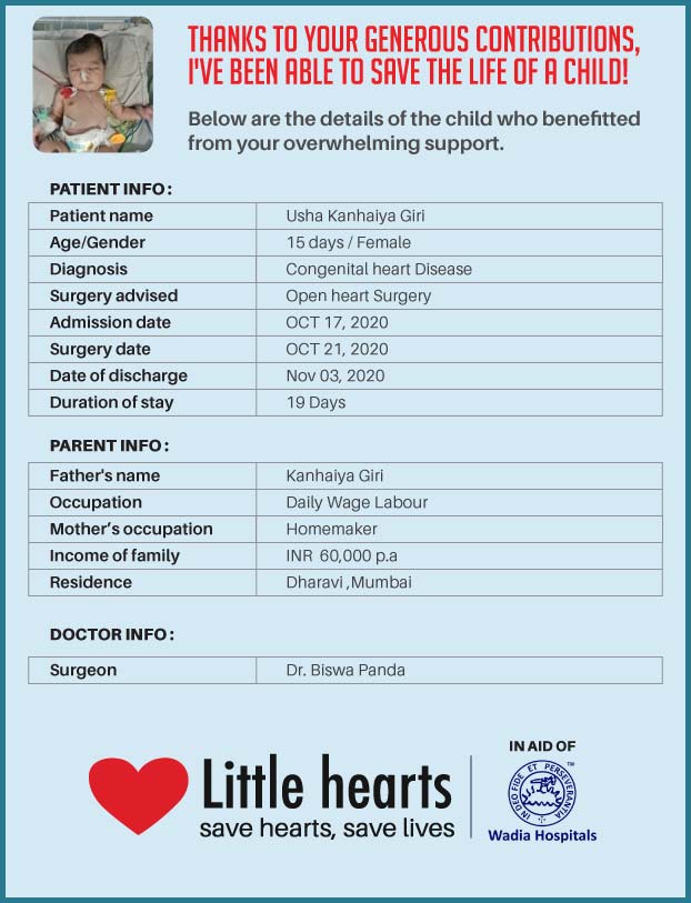 The money raised will be given directly after the campaign ends to the B J Wadia Charitable Hospital - Mumbai. Once the money is given to the hospital they will use it to save the life of a poor child and share the details with me. I shall then send you an update about the child we have saved so that you know where your money has gone.