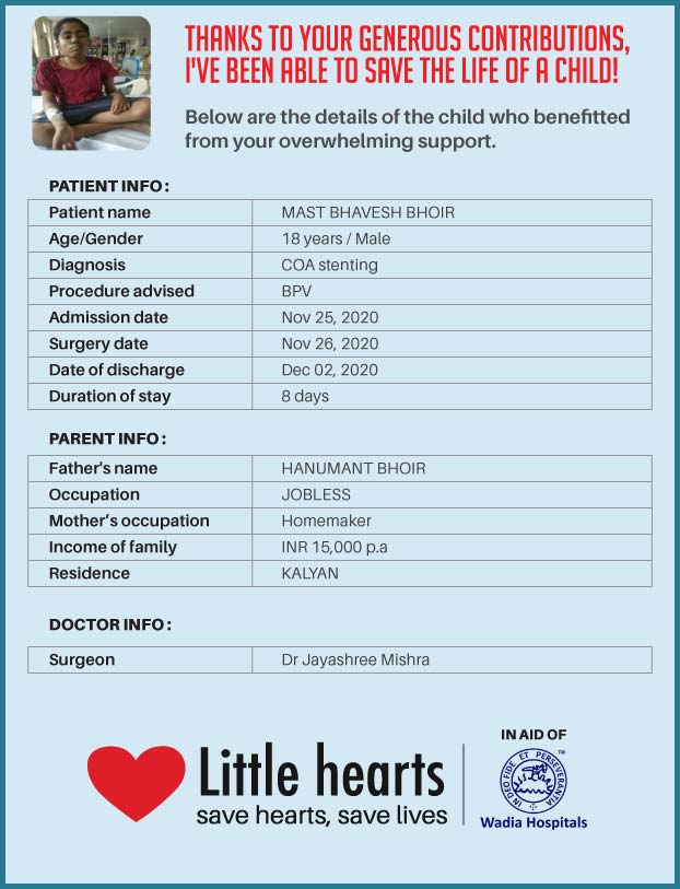 The money raised will be given directly after the campaign ends to the B J Wadia Charitable Hospital - Mumbai. Once the money is given to the hospital they will use it to save the life of a poor child and share the details with me. I shall then send you an update about the child we have saved so that you know where your money has gone.