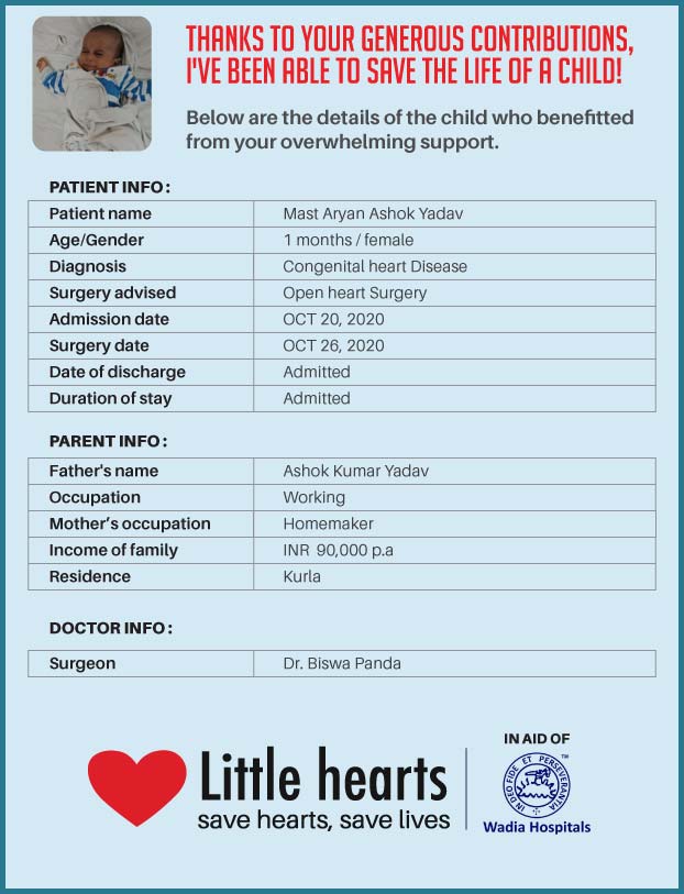 Yes. After the money has been collected it will be transferred by Fueladream to B J Wadia charitable hospital. It will take from 30-60 days after that to get details of who the beneficiary child was with details of her parents, her picture etc. Once I get this information from the team at B J Wadia hospital, I shall upload this on the UPDATES section of this campaign. You will then get an alert & can read details about the beneficiary.