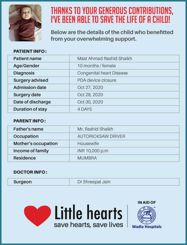 The money raised will be given directly after the campaign ends to the B J Wadia Charitable Hospital - Mumbai. Once the money is given to the hospital they will use it to save the life of a poor child and share the details with me. I shall then send you an update about the child we have saved so that you know where your money has gone.