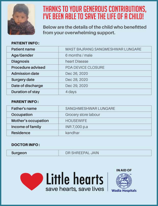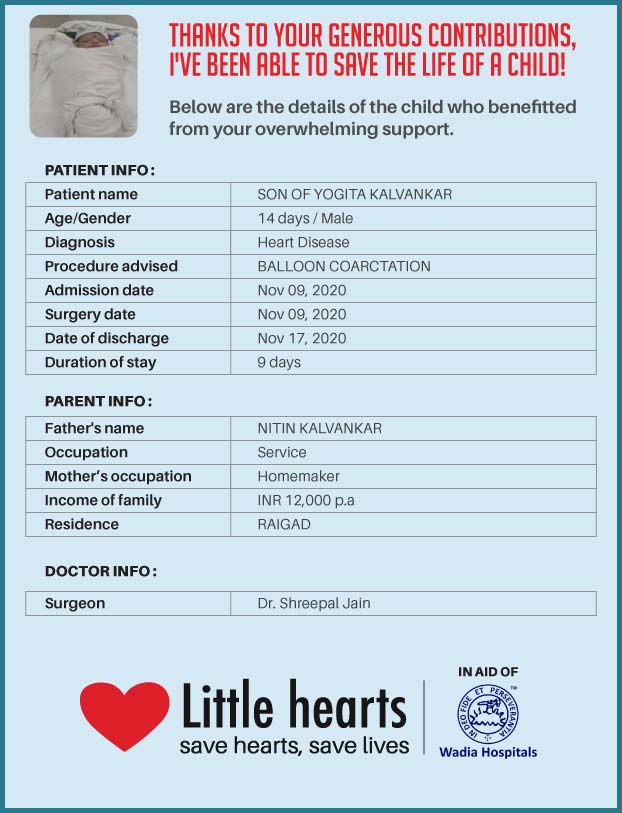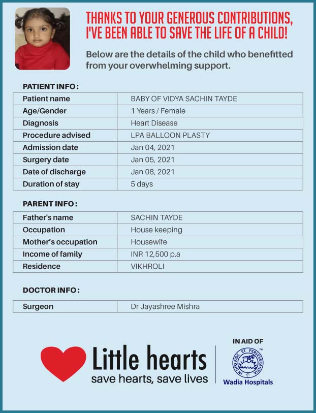 The money raised will be given directly after the campaign ends to the B J Wadia Charitable Hospital - Mumbai. Once the money is given to the hospital they will use it to save the life of a poor child and share the details with me. I shall then send you an update about the child we have saved so that you know where your money has gone.