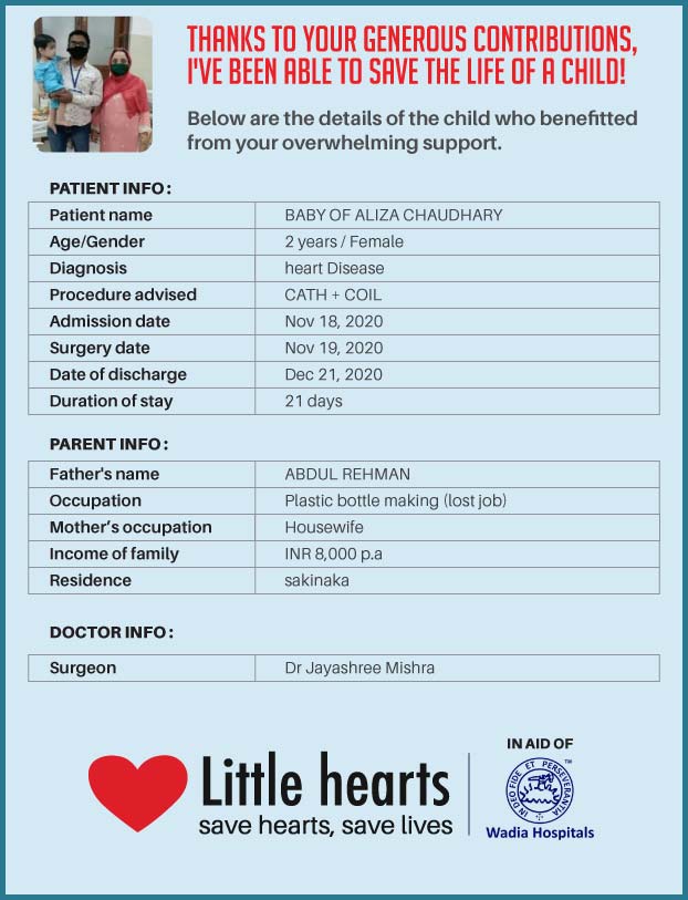 The money raised will be given directly after the campaign ends to the B J Wadia Charitable Hospital - Mumbai. Once the money is given to the hospital they will use it to save the life of a poor child and share the details with me. I shall then send you an update about the child we have saved so that you know where your money has gone.