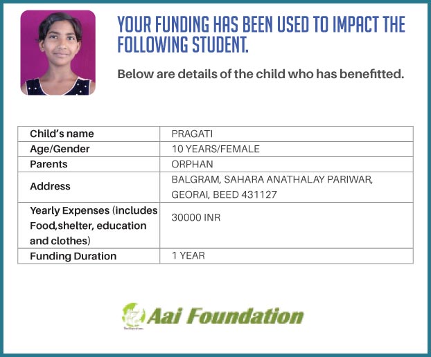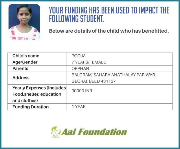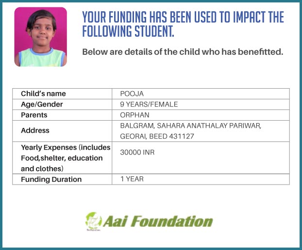 To ensure that there is complete transparency I shall get a report from Balgram (this takes between 1 to 3 months usually after the funds are raised & transferred to them) telling me who benefitted from the funding. The details will then be posted on the UPDATES section of my campaign and will be in a format like the one below. As soon as I post an update, the platform will send an EMAIL alert to all the funders - i.e. to you. Click on the link on the email and you can read about which child benefitted. That's transparent right.