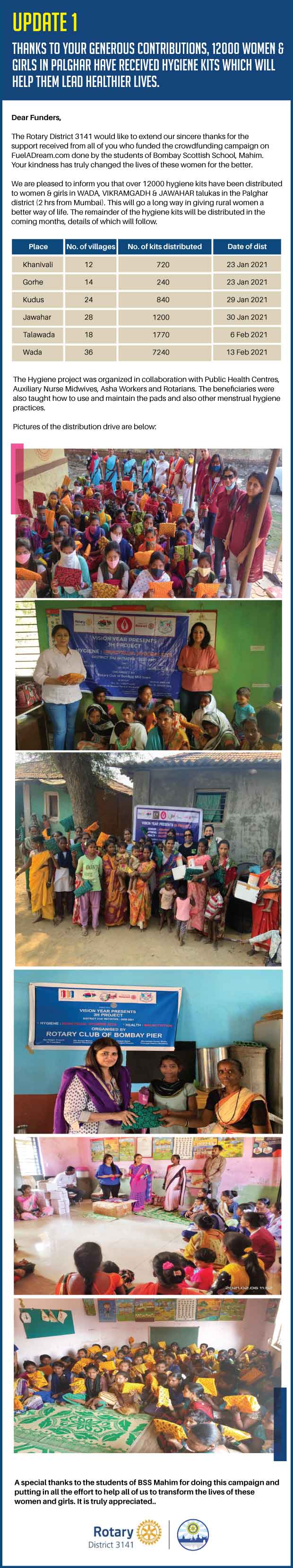 Yes. After the money has been collected it will be transferred by Fueladream to ROTARY CLUB OF BOMBAY PIER CHARITABLE TRUST. We will update you on the details of the beneficiaries as soon as possible. Once we get this information we shall upload a report on the UPDATES section of this campaign. You will then get an alert & can read details about the beneficiaries.