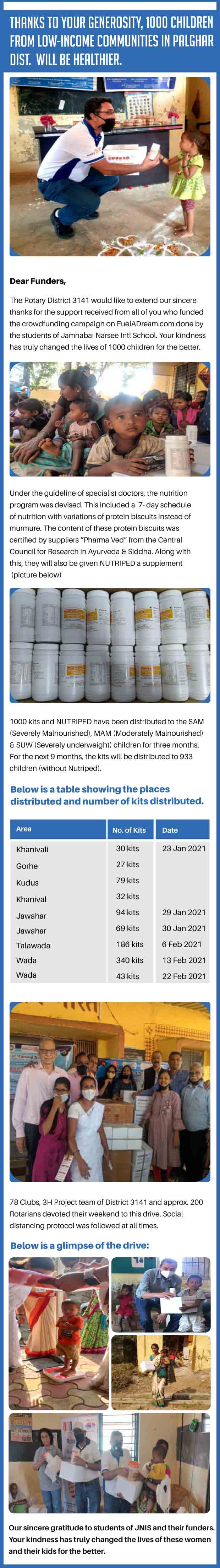 I was shocked & surprised to learn that in Mumbai and Palghar districts MALNUTRITION is a crisis that impacts thousands of children. Several low-income communities are fighting the long-term ill-effects of malnourishment. It was also a pleasant surprise to learn that It just takes INR 3000 for an entire year to drastically improve the lives of a malnourished child with a POSHAK AAHAR - Food supplements in a MEAL BOX. This is an initiative being done by Rotary. These supplements are given monthly.