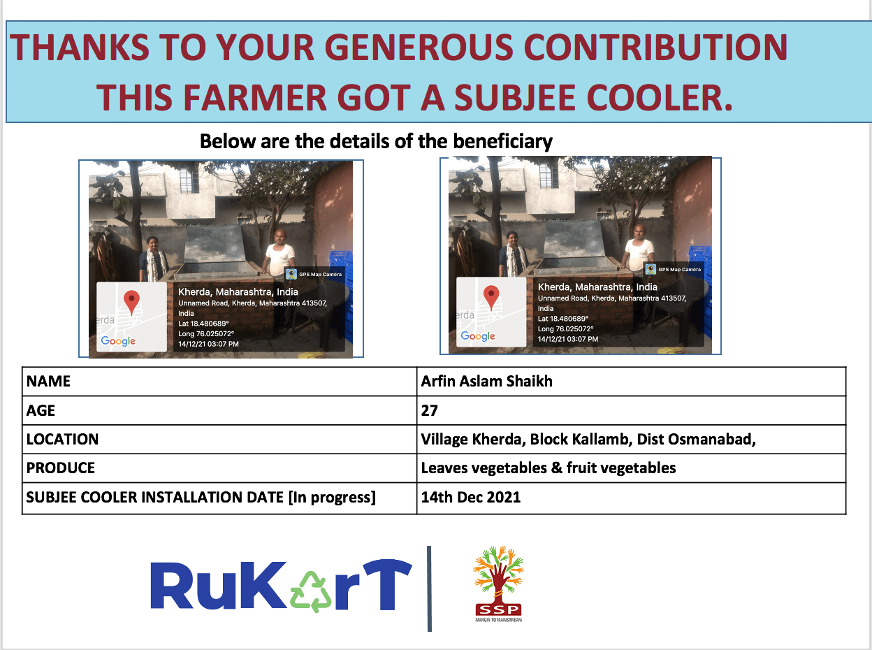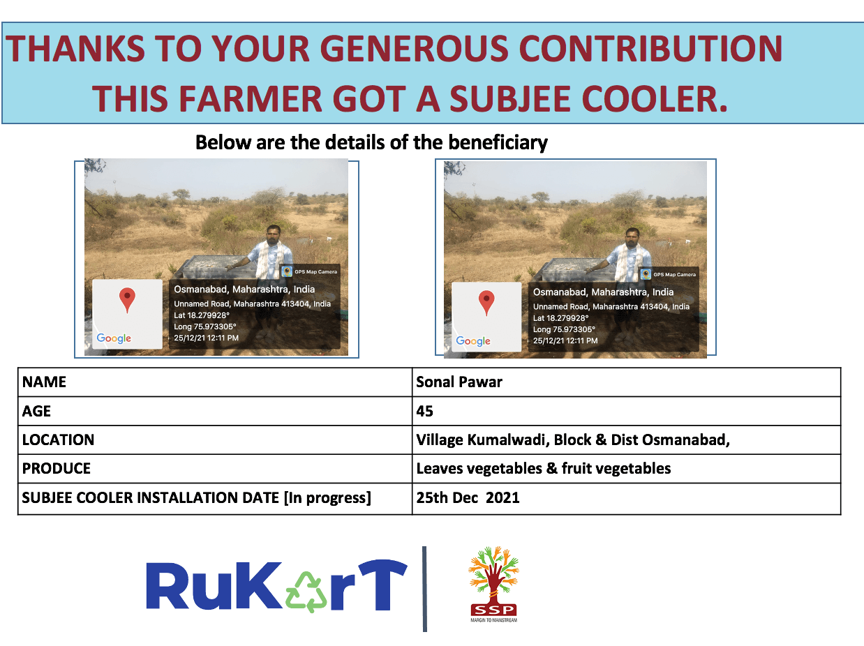 I am running a crowdfunding campaign to help small farmers across Maharashtra who grow vegetables and fruits. Most of these farmers end up selling their produce at a low price as they do not have any way to store it as these products are perishable. Through this campaign, I want to help provide a Subjee Cooler to these farmers across Maharashtra. This will help them store their produce, reduce wastage, and improve the price sell they sell it at. This dramatically improves their income and will impact the well being of their entire family.
