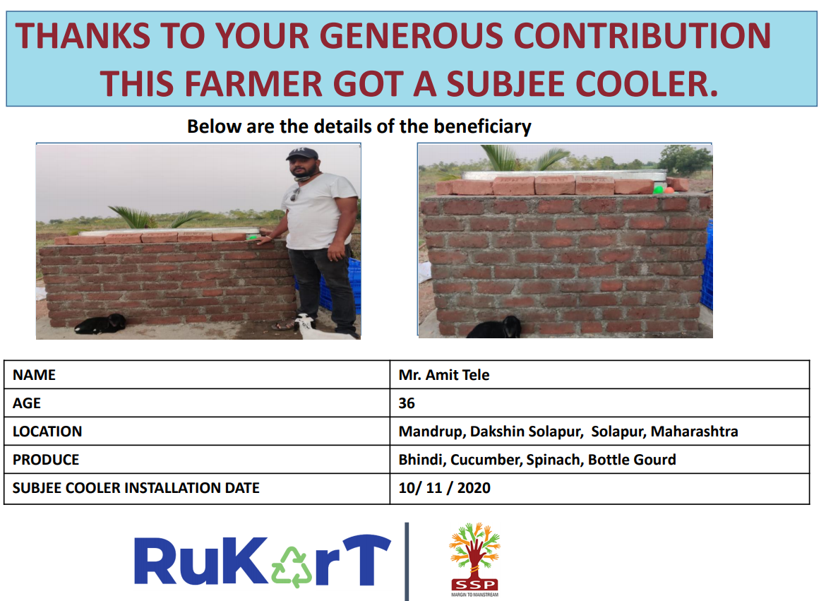 I am running a crowdfunding campaign to help small farmers across Maharashtra who grow vegetables and fruits. Most of these farmers end up selling their produce at a low price as they do not have any way to store it as these products are perishable. Through this campaign, I want to help provide a Subjee Cooler to these farmers across Maharashtra. This will help them store their produce, reduce wastage, and improve the price sell they sell it at. This dramatically improves their income and will impact the well being of their entire family.