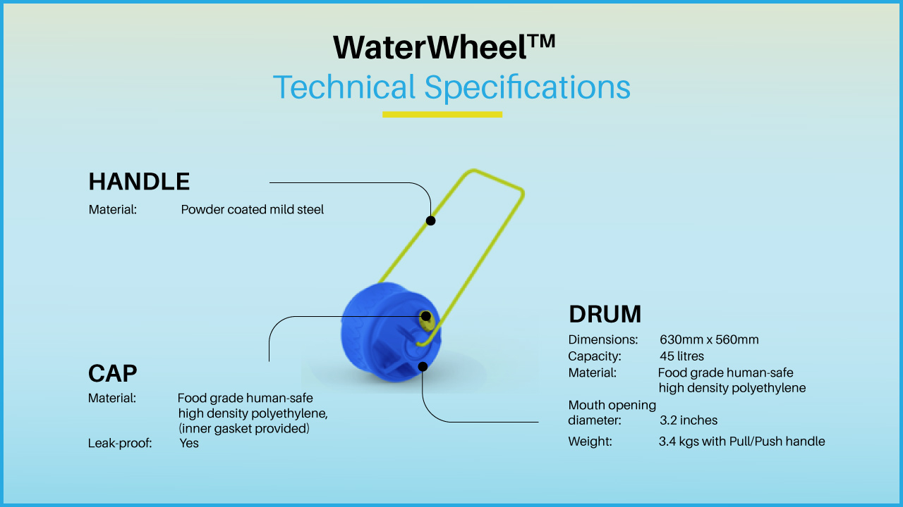 The WATER WHEEL is a cylindrical plastic container that can hold up to 45 litres of water. The handles help people to roll it on the ground without the physical strain that occurs while carrying water pots on head, shoulders or waist.