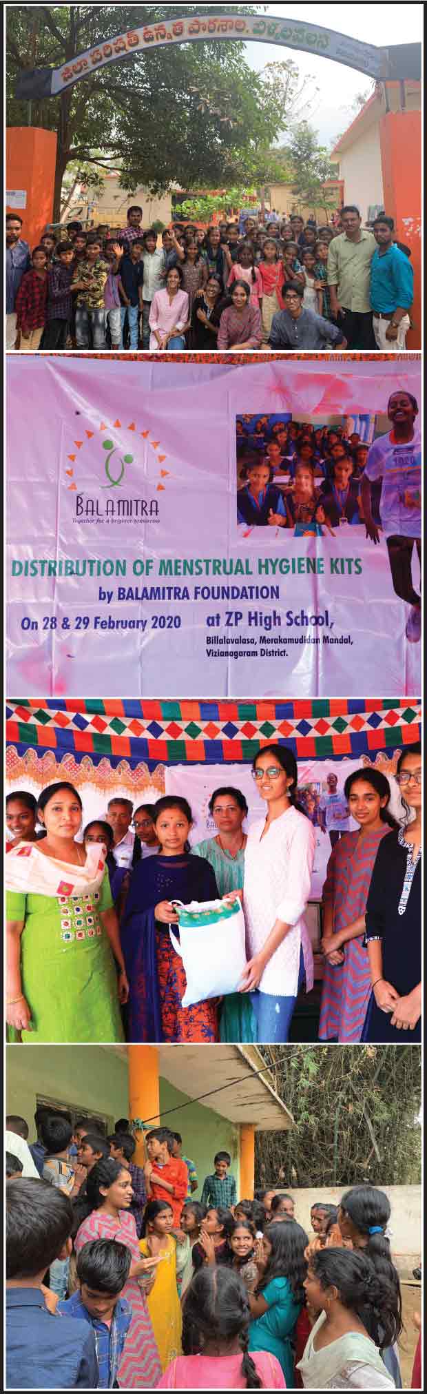The Balamitra Foundation, an NGO based in Hyderabad aims to provide menstrual hygiene kits in Billalavalasa. It is a village in Merakamudidam Mandal, Vizianagaram district, Andhra Pradesh. The population consists mostly of agricultural labourers and daily wage workers. It houses the Zilla Parishad High School in which 42% are girls. By providing menstrual hygiene kits to the menstruating girls here, Balamitra is enhancing their schoolgoing experience as they don’t have to miss school for a few days every month. In addition, Balamitra conducts an engagement session with the schoolgirls and their mothers about the importance of maintaining menstrual hygiene