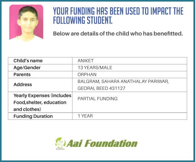 The fact that just INR 2500 per month can make a difference in the life of a fellow student who is an orphan in a rural area made me realise that I must do something about it. Please support my campaign as we can together transform the lives of at least one and possibly more orphan children in rural Maharashtra.