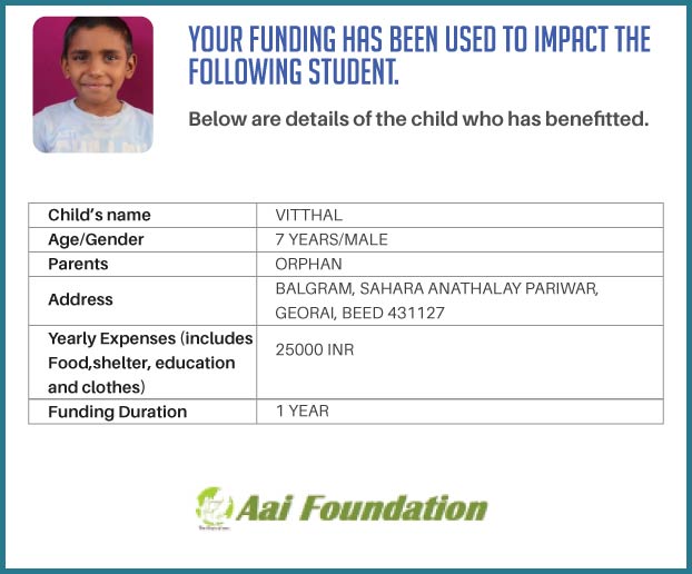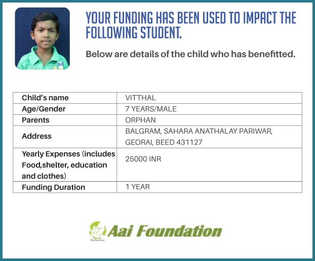 The fact that just INR 2500 per month can make a difference in the life of a fellow student who is an orphan in a rural area made me realise that I must do something about it. Please support my campaign as we can together transform the lives of at least one and possibly more orphan children in rural Maharashtra.
