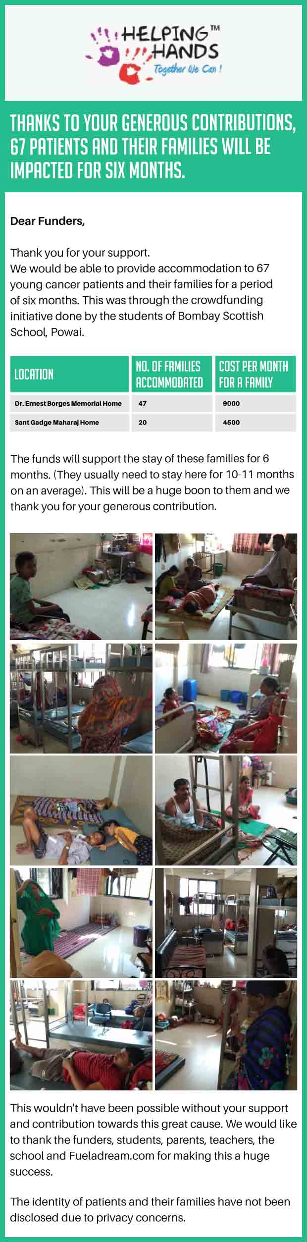 Getting accommodation at a good clean place will help them in continuing treatment as well as preventing infections thereby preventing the death of these children due to cancer or its complications. The minimum cost of providing stay to a cancer patient and his family (for a maximum of 4 members) would be just INR 300 per day which works out to about INR 9000 over a 30 day period.