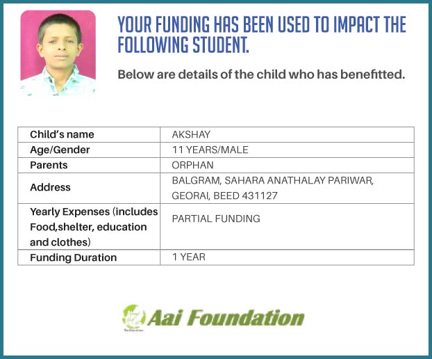 The fact that just INR 2500 per month can make a difference in the life of a fellow student who is an orphan in a rural area made me realise that I must do something about it. Please support my campaign as we can together transform the lives of at least one and possibly more orphan children in rural Maharashtra.