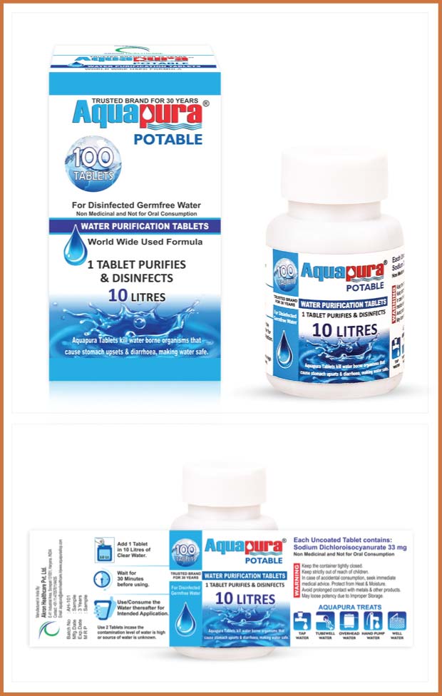 Aquapura Water Purification Tablets by Akron Healthcare make water sterile and safe quickly. Aquapura tablets kill bacteria, spores, viruses and prevent water borne diseases. Akron Healthcare is committed to reducing suffering associated with water borne diseases by offering innovative and cost effective products at point of use.