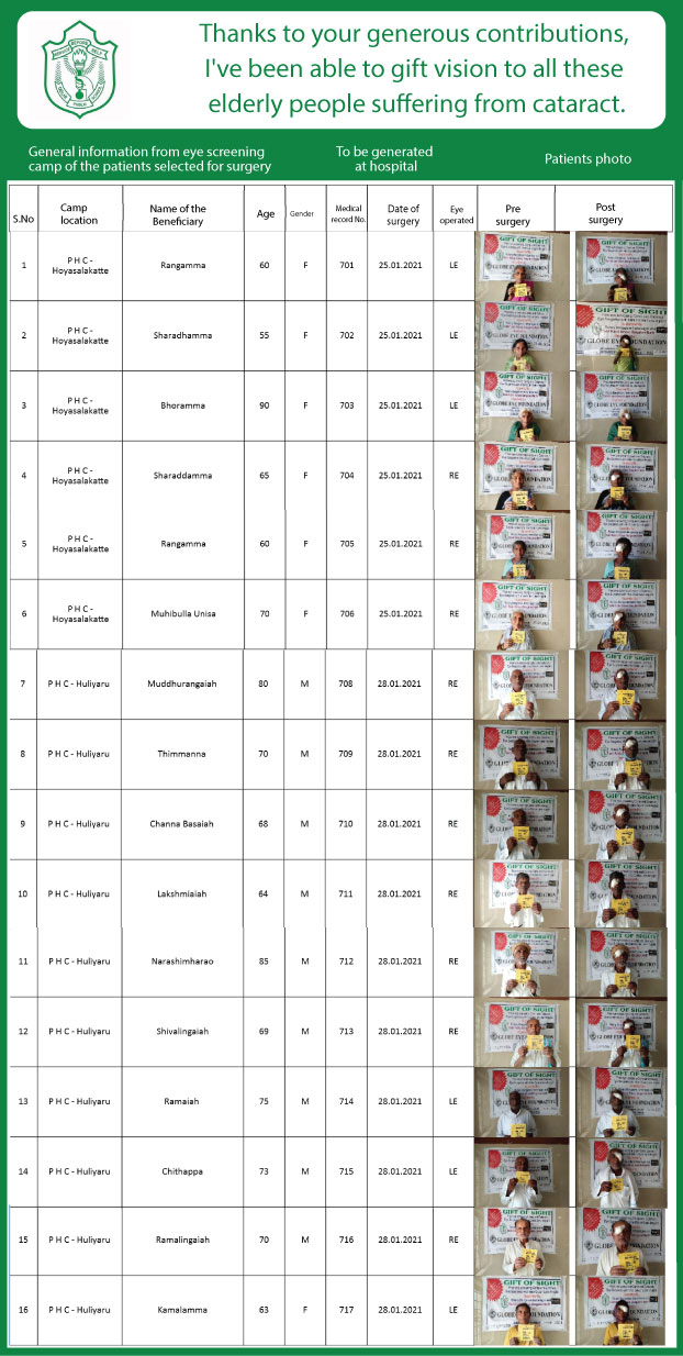 The cataract surgeries are for the elderly (usually 65 years + in the rural areas of KOLAR, HOSKOTE & CHINTAMANI. This will help people in rural Karnataka who are in need of urgent surgery.