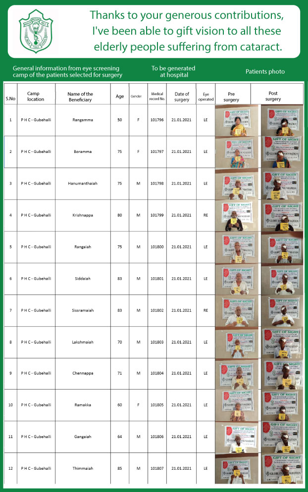 The cataract surgeries are for the elderly (usually 65 years + in the rural areas of KOLAR, HOSKOTE & CHINTAMANI. This will help people in rural Karnataka who are in need of urgent surgery.