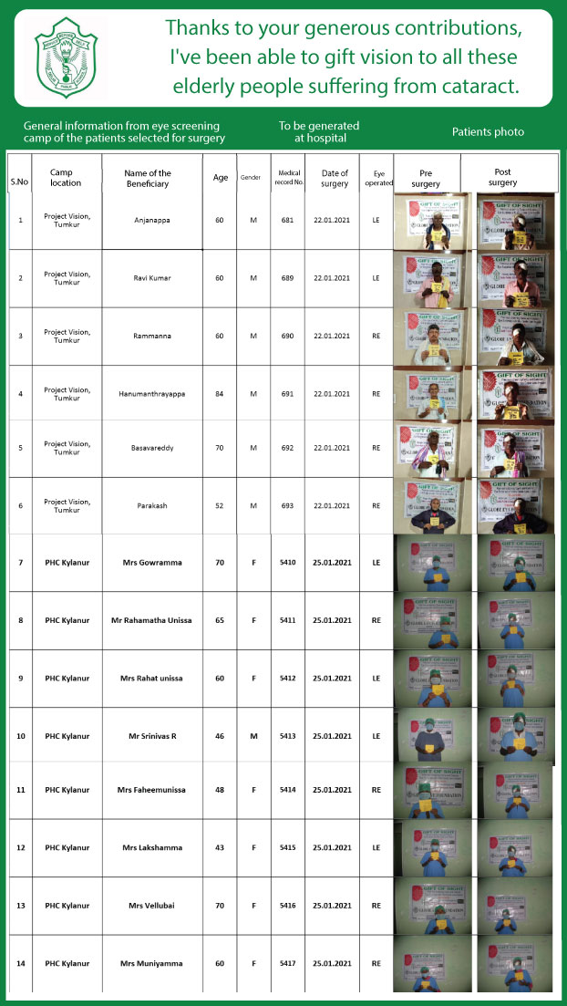 The cataract surgeries are for the elderly (usually 65 years + in the rural areas of KOLAR, HOSKOTE & CHINTAMANI. This will help people in rural Karnataka who are in need of urgent surgery.