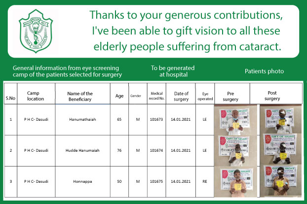 The cataract surgeries are for the elderly (usually 65 years + in the rural areas of KOLAR, HOSKOTE & CHINTAMANI. This will help people in rural Karnataka who are in need of urgent surgery.
