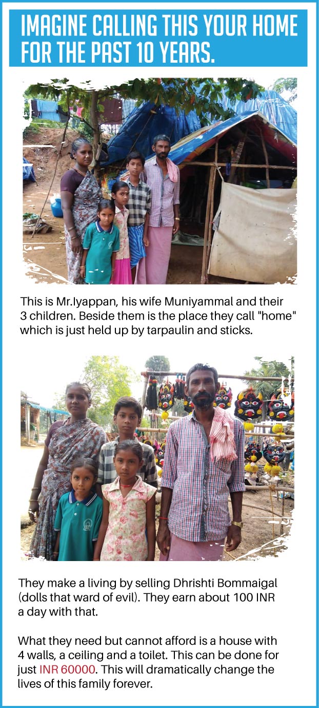 The community is trying to eke out a living during the pandemic by selling Dhrishti Bommaigal. (Dolls that ward of evil). They are barely able to make a living and do not have any financial resources. They desperately need a proper house.