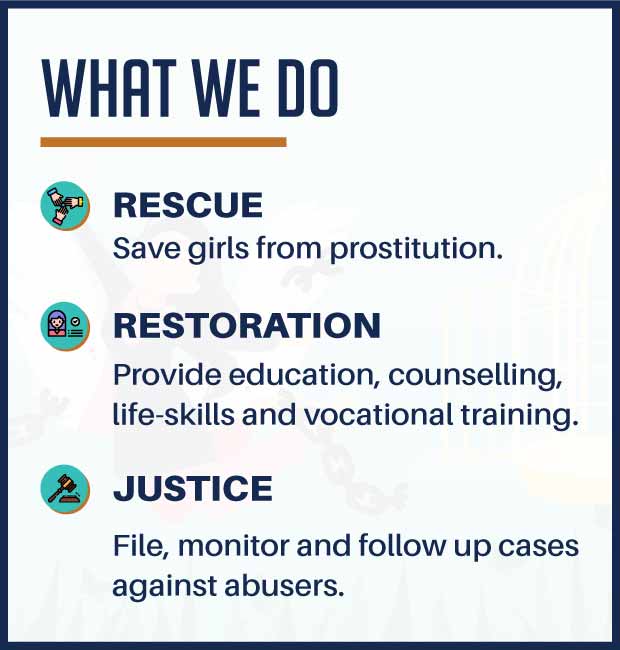 Freedom Firm aggressively pursues convictions by assisting public prosecutors at each stage of the criminal trial. Rescued girls are encouraged to testify against their abusers. We file an appeal or petition in the higher courts whenever our case is dismissed in lower courts. We have a team that monitors and follows up each case.
