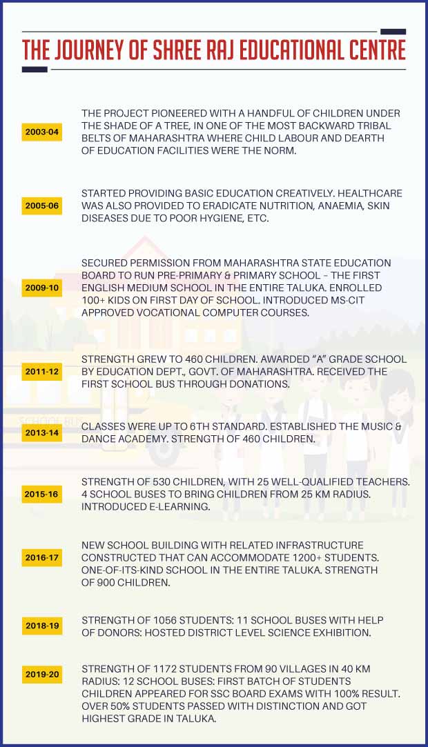 Parli was one of the most backward & undeveloped tribal belts in Raigad district, Maharashtra. Before Shree Raj Educational Centre was established, there was a lack of basic infrastructure and facilities in the area, young children were made to work in neighbouring breweries. The situation of the girl children was worse, they had to take care of the entire household and their siblings, their education was neglected and were married off at a very young age. For those who lived in this area, good quality education was a distant dream. To change this, the Rural Education project was launched in the year 2009.