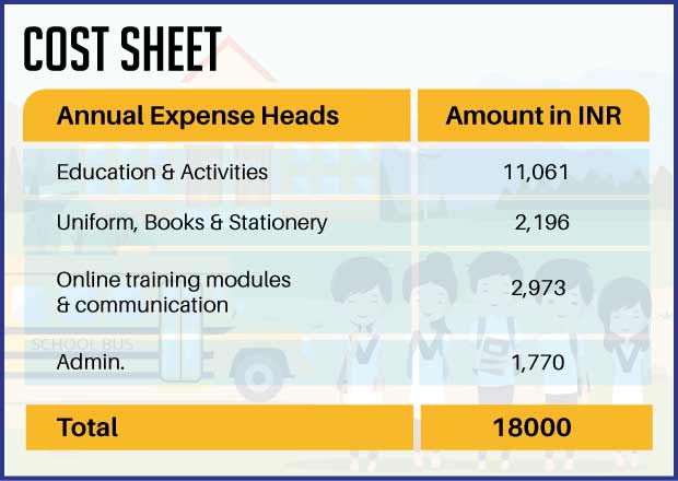All it takes is INR 1500 to impact a child for a month. This includes one meal a day, education, uniforms, stationery, transport, e-learning, computer training, sports, health-check-ups, etc.