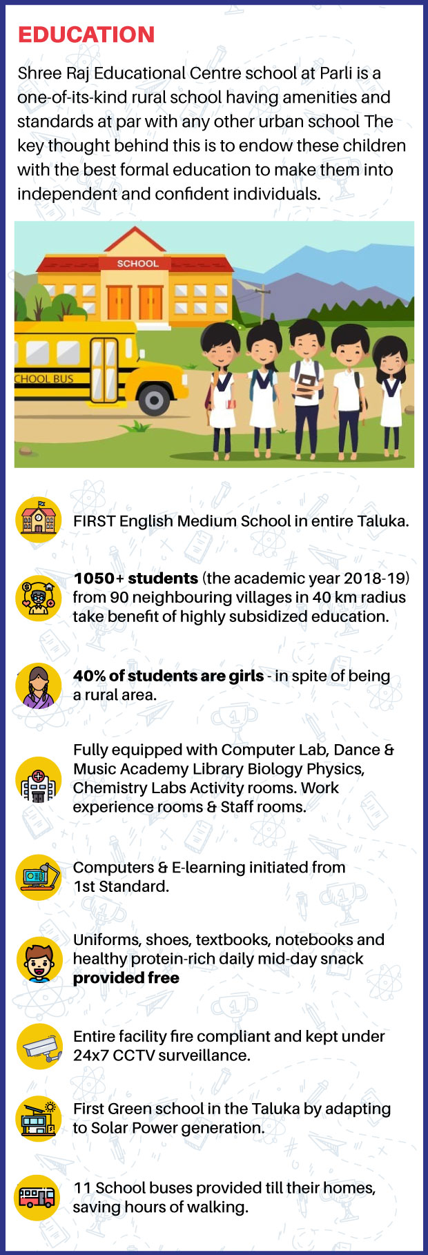 Shree Raj Educational Centre is a one-of-its-kind rural school having amenities and standards at par with any other urban school. The key thought behind this institution is to endow these children with the best formal education to make them independent and confident individuals. 1079 children are enrolled in the school. The school supports the children by ensuring that all their educational expenses including uniforms, books, educational kits, meals as well as transport are being provided for.